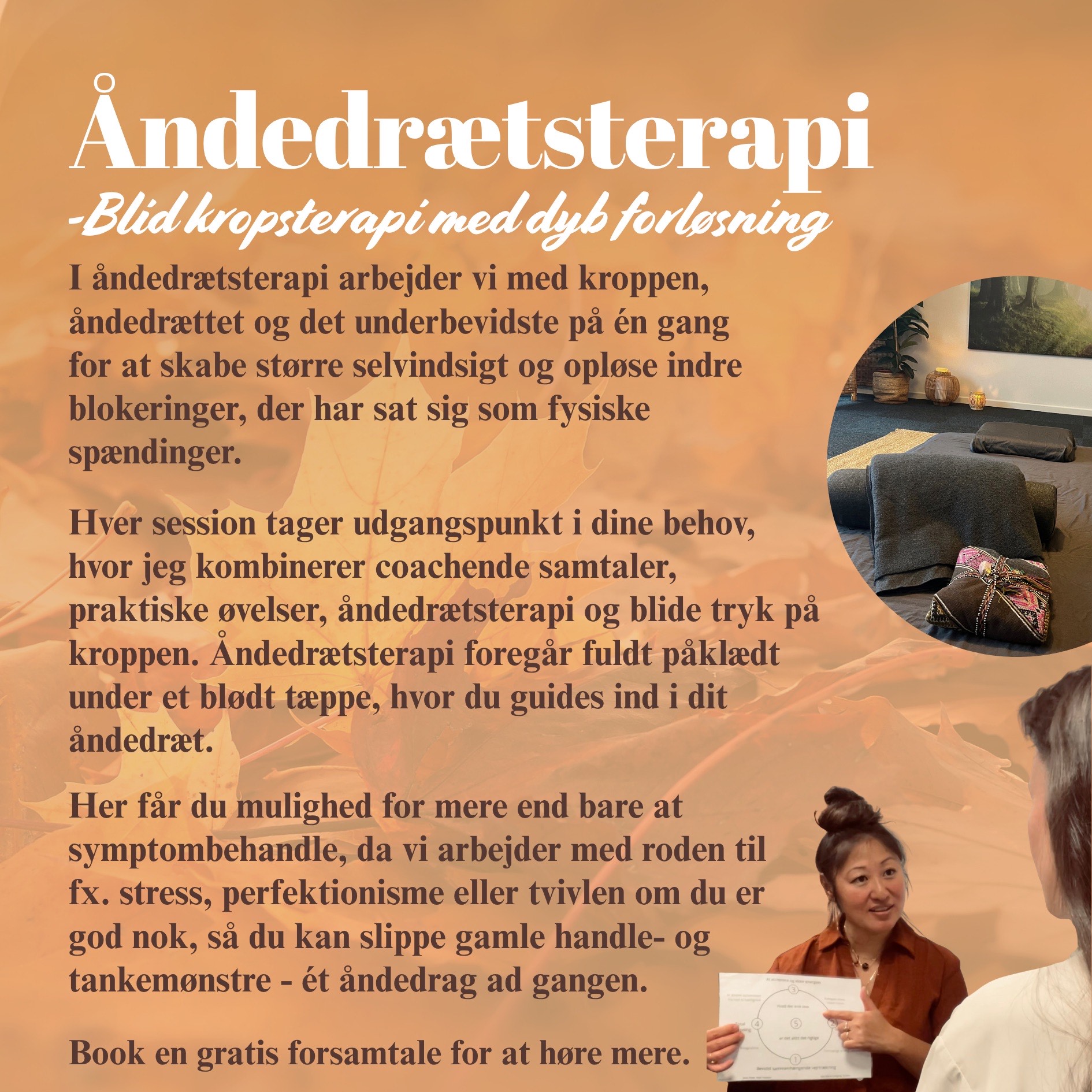 Efter samtalen er det tid til åndedrætsterapien, som foregår fuldt påklædt på en madras på gulvet, hvor du ligger under et blødt tæppe. I baggrunden vil være musik, der er udvalgt til at støtte din proces. Her bliver du guidet til at mærke din krop og til at begynde bevidst sammenhængende vejrtrækning, som er et blid cyklisk åndedræt uden pauser mellem ind- og udånding.